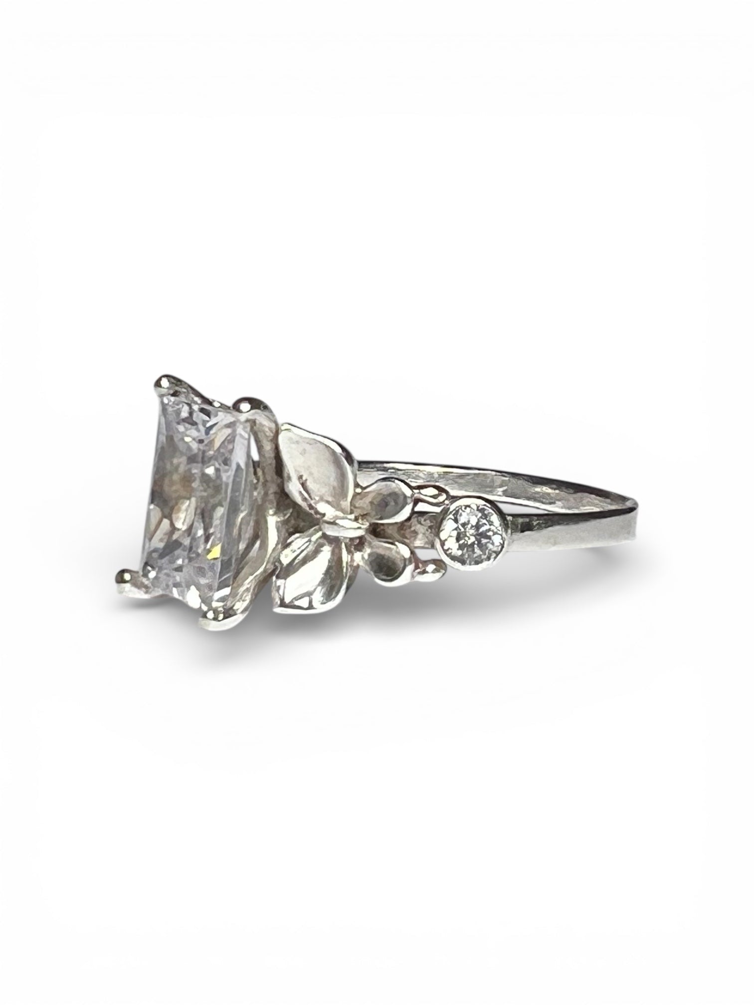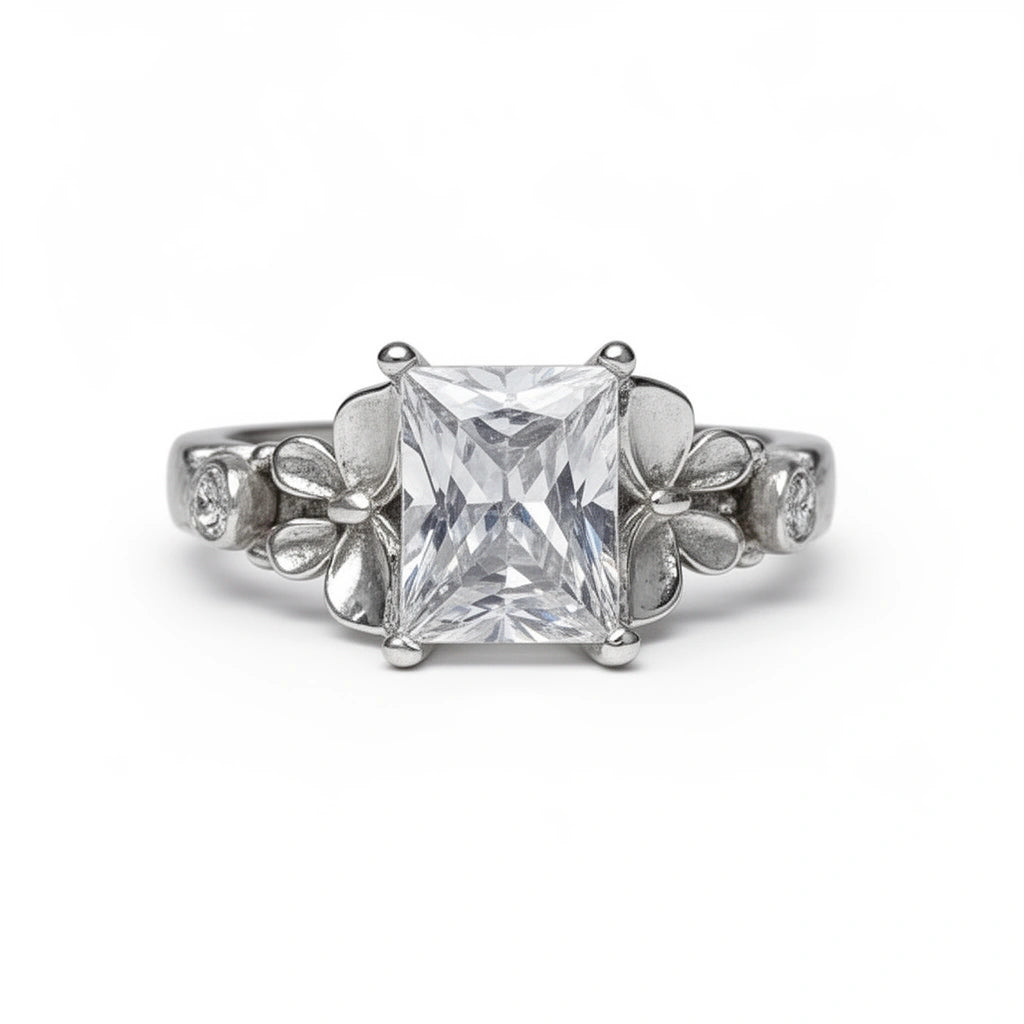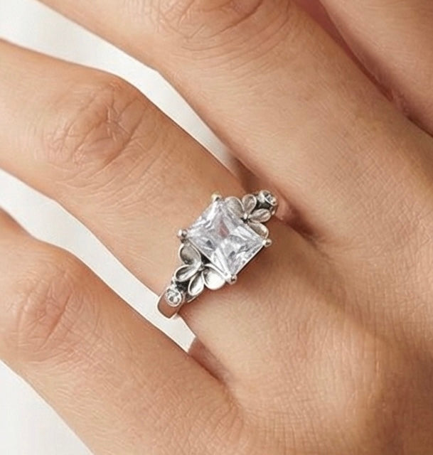 The Ever Bloom Ring features a luminous rectangular center stone framed by sculpted florals and butterfly details on either side of the band. Delicate petals, gentle wings, and sparkling accents come together in a garden-inspired design that feels romantic, symbolic, and timeless.