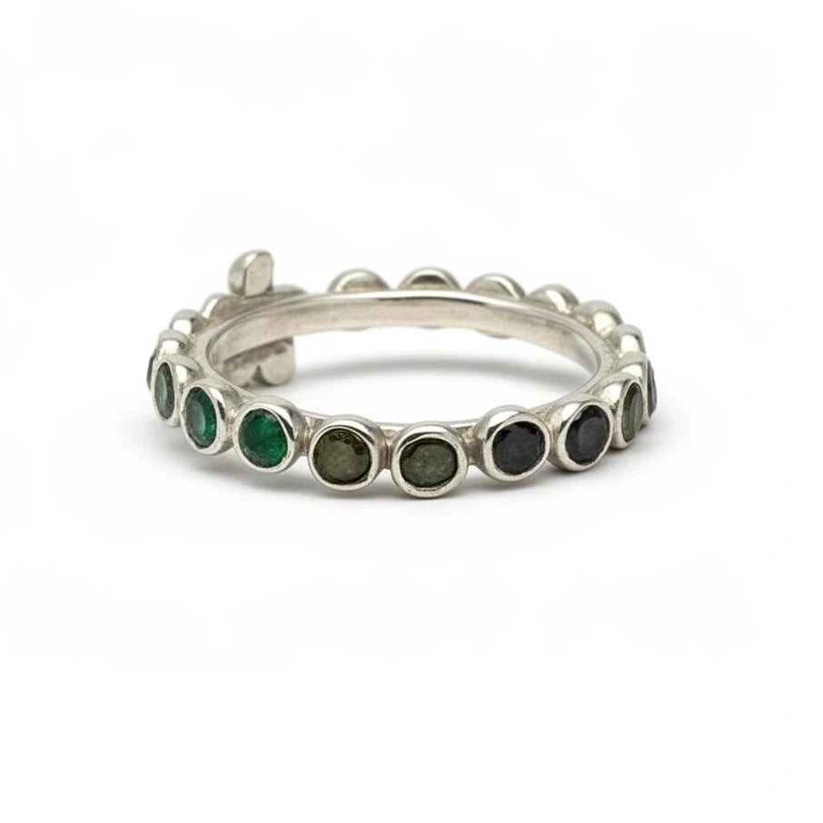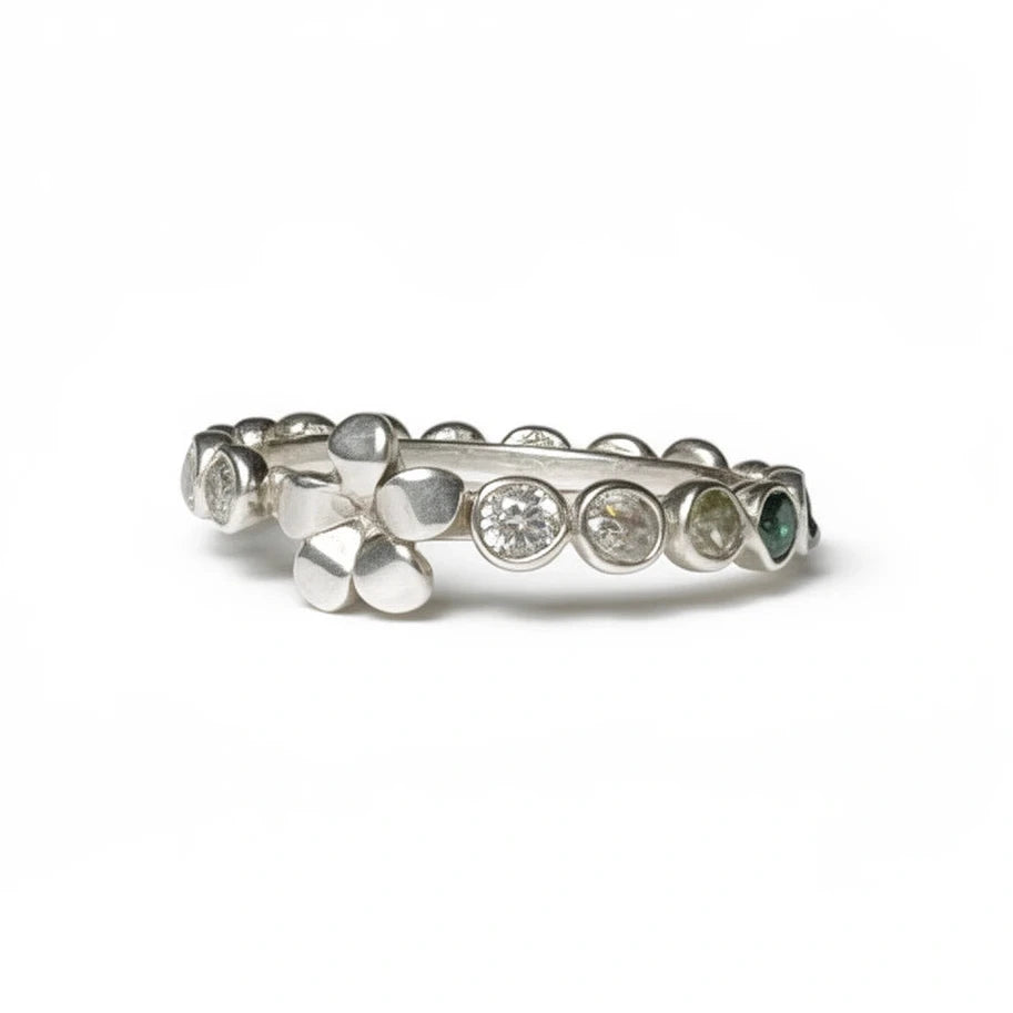 The Seed Dot Band features a rhythmic row of softly sculpted bezel-set stones, symbolizing seeds scattered before bloom. Organic yet refined, this modern band is designed to ground delicate florals or stand confidently on its own.