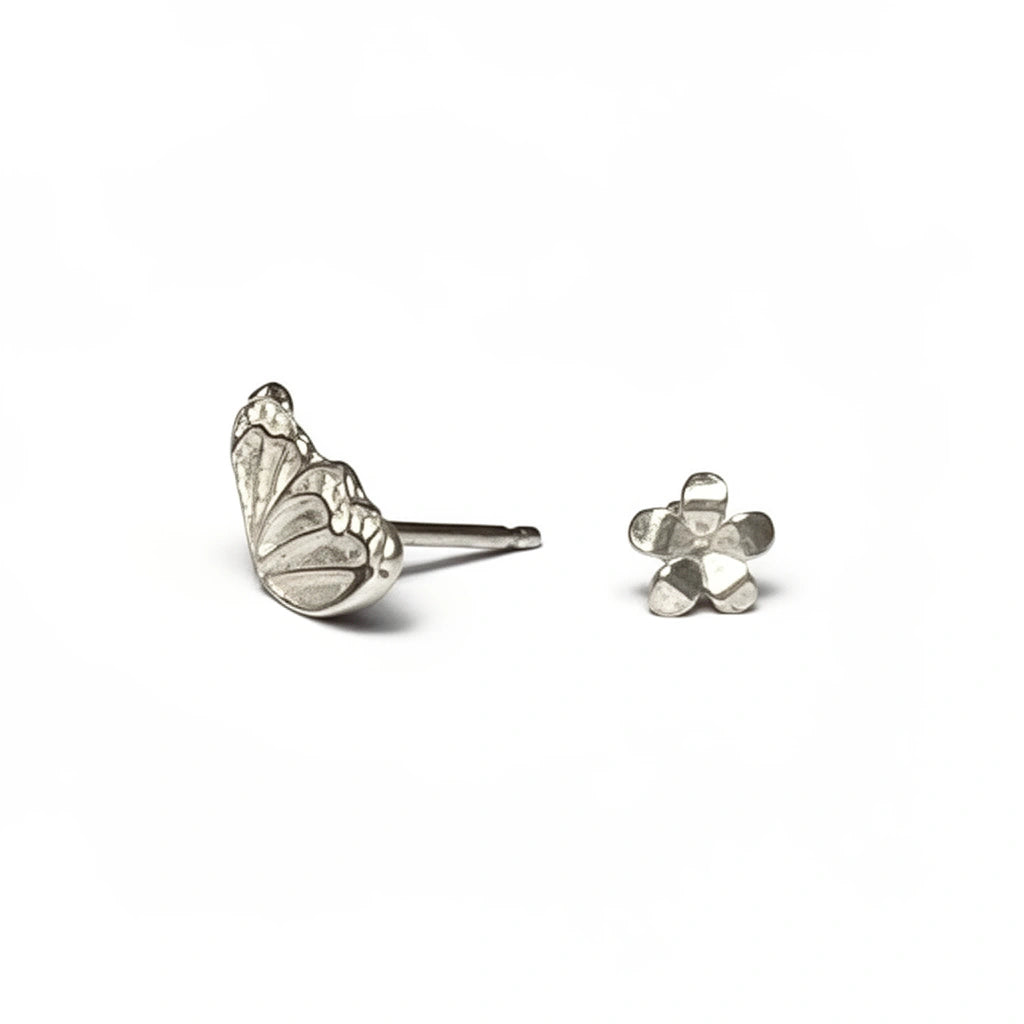 The Flutter & Bloom Studs feature a mismatched pair of sculpted earrings — one butterfly wing and one flower bloom — designed to feel modern, poetic, and effortlessly wearable. Softly detailed and organic in form, this pair captures the harmony between movement and stillness.